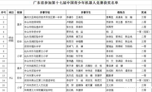 广东是青少年机器人活动的发源地之一,家门口的赛事我们应当努力,也有出彩。我省选派29支队伍参加全部五大项目的角逐,在四类竞技项目中荣获一等奖8项,二等奖10项,三等奖6项;在创意项目中获得优秀奖3项,鼓励奖2项,总体成绩位居全国前列。其中,中山市华侨中学和深圳市南山区第二外国语学校,分别在综合技能高中组、FLL初中组中摘取桂冠,佛山市顺德区李兆基中学在WER高中组获得季军。
