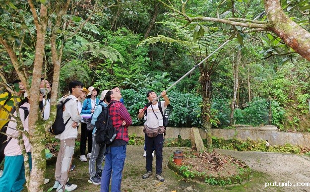 廖文波教授作了题为《中国植物多样性大尺度地理分布格局》的专题讲座,从物种的衍生、起源、兴盛、灭绝再重新衍生、繁盛,以及中国地质的特点、气候的变化等专业层面,阐述了中国物种分布的原因和特点。其后,全体师生自由组合,分为五大小组,各自开展科考活动。两个植物组分由廖文波、凡强教授带领,观察和记录不同类型的植物,采集相应标本;鸟类组在张学聪老师带领下,观察鸟类品类,了解鸟类生活习性,听鸟鸣辩识品种;昆虫组由谢委才研究员带领,捕捉各类昆虫,制作昆虫标本;生态保护组的同学则在李步杭高工的带领下,实地考察基地各类监测设施,了解监测空气、水质、土壤等环境指标的方法。