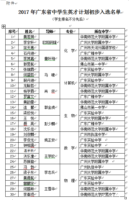 附件:2017年广东省中学生英才计划初步入选名单